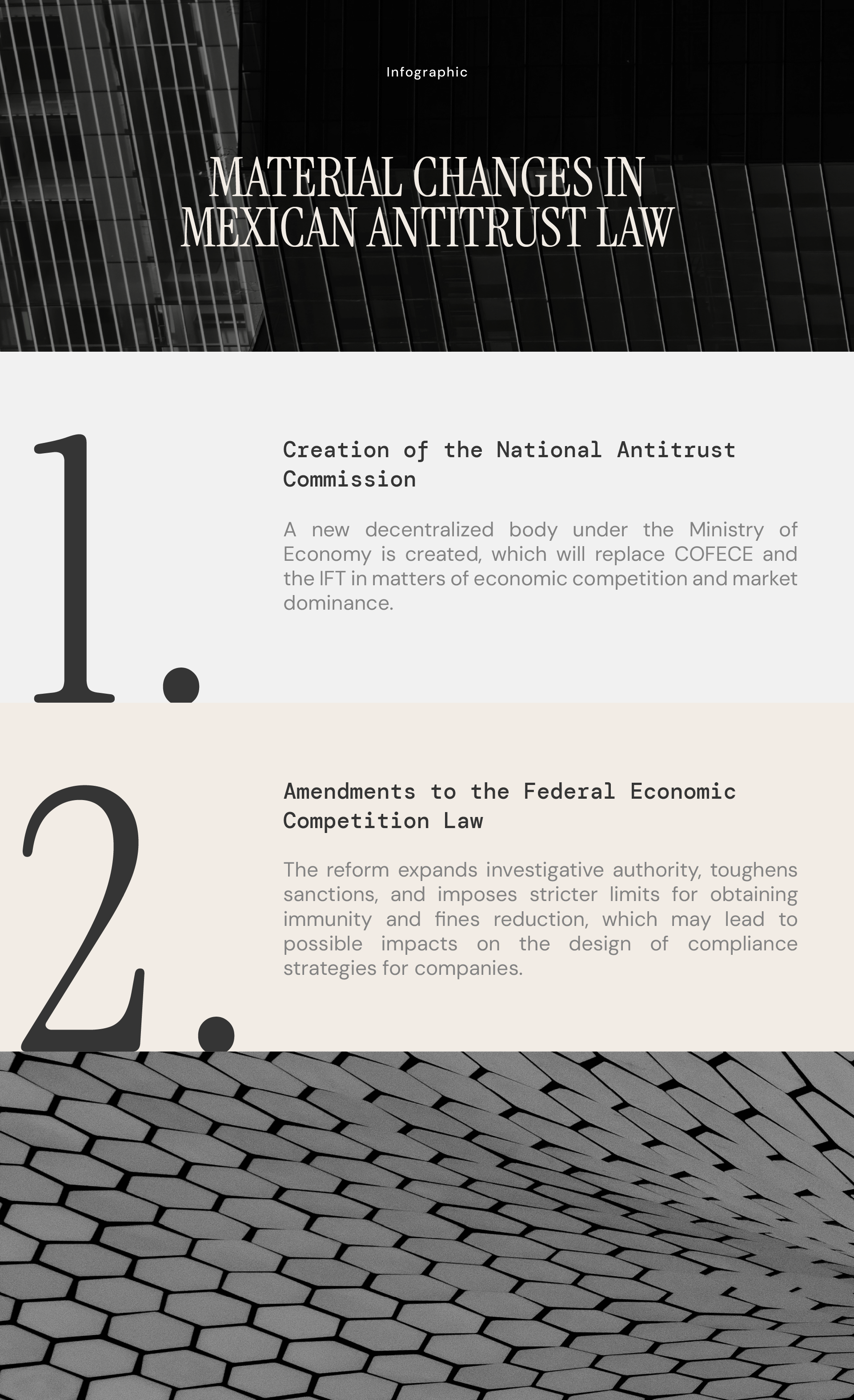On June 30, 2025, the Congress of the Union approved a reform to the Federal Law on Economic Competition (the “LFCE”) that replaces the Federal Commission on Economic Competition (“COFECE”) and the Federal Institute of Telecommunications (“IFT”) [with regard to its powers in matters of economic competition and preponderance], with the National Antimonopoly Commission (“CNA”), a new decentralized body of the Ministry of Economy (the “Reform”).