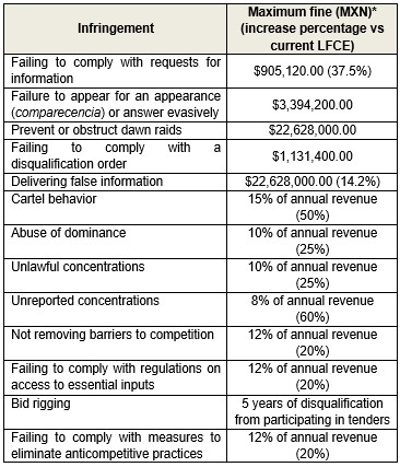 The Reform increases the enforcement measures and fines established in the LFCE as follows: